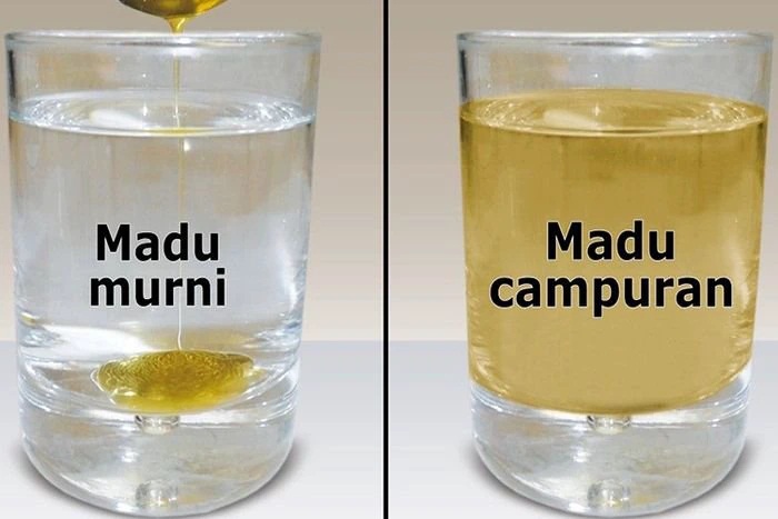 Madu palsu akan larut dalam air sementara madu asli jika bercampur ke dalam air akan menjadi gumpalan.