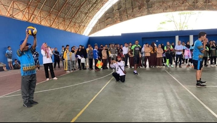 Dibuka secara Resmi perdana turnamen Volly ball, Bupati Kopli ansori ikut bergabung dengan tim Alumni 99 melawan Tim Pinang Belapis.[Tuti]