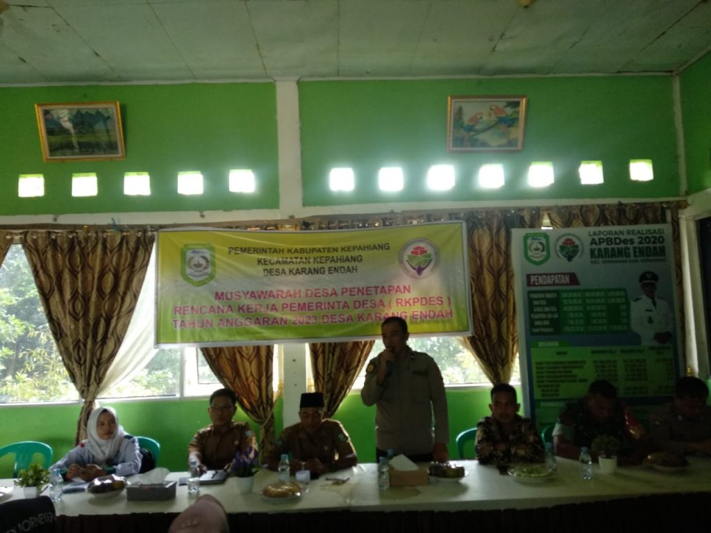 Planning giat tahun 2023 disampaikan secara rinci oleh Kades dengan menjelaskan terkait rencana kerja Pemerintah Desa tahun anggaran 2023 di Desa Karang Endah, Selanjut himbauan Camat Kepahiang disampaikan Abdullah, S.Sos selaku Kasi PMD mengharapkan nantinya seluruh kegiatan yang menggunakan anggaran dana Desa (ADD) maupun DD sangat diharapkan pada Kepala Desa, perangkat Desa sebagai pengguna anggaran dapat menggunakan sesuai regulasi yang ada, Sekaligus membuka secara resmi Musdes RKPDES.