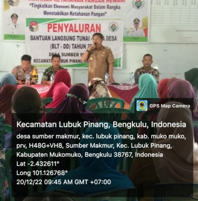 Mukomuko – Bengkulupost.id, Pemerintah Sumber Makmur Kecamatan Lubuk Pinang kabupaten Mukomuko Propinsi Bengkulu, Kembali menyalurkan Bantuan langsung Tunai ( BLT-DD ) Tahap ke IV tahun 2022 terhitung bulan Oktober,Nopember dan Desember tahun 2022,