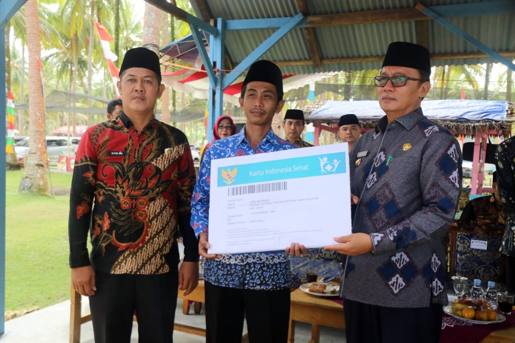 Bengkulu Post – Kaur. Bupati Kaur H. Lismidianto, SH, MH didampingi Kepala BPJS Kesehatan Kaur Ahmad Fauzi Nugraha, S. Farm, M.M, menyerahkan secara simbolis Kartu Indonesia Sehat kepada dua perwakilan Kepala desa diantaranya Andi Nopriandi Kepala Desa Padang Petron dan Alfian Aidi Kepala Desa Air dingin, Jum’at (24/2/2023) di Pantai Putri Pinang Tawar Desa Pengubaian di sela-sela kegiatan silaturahmi dan Sosialisasi Program Pemerintah Daerah.