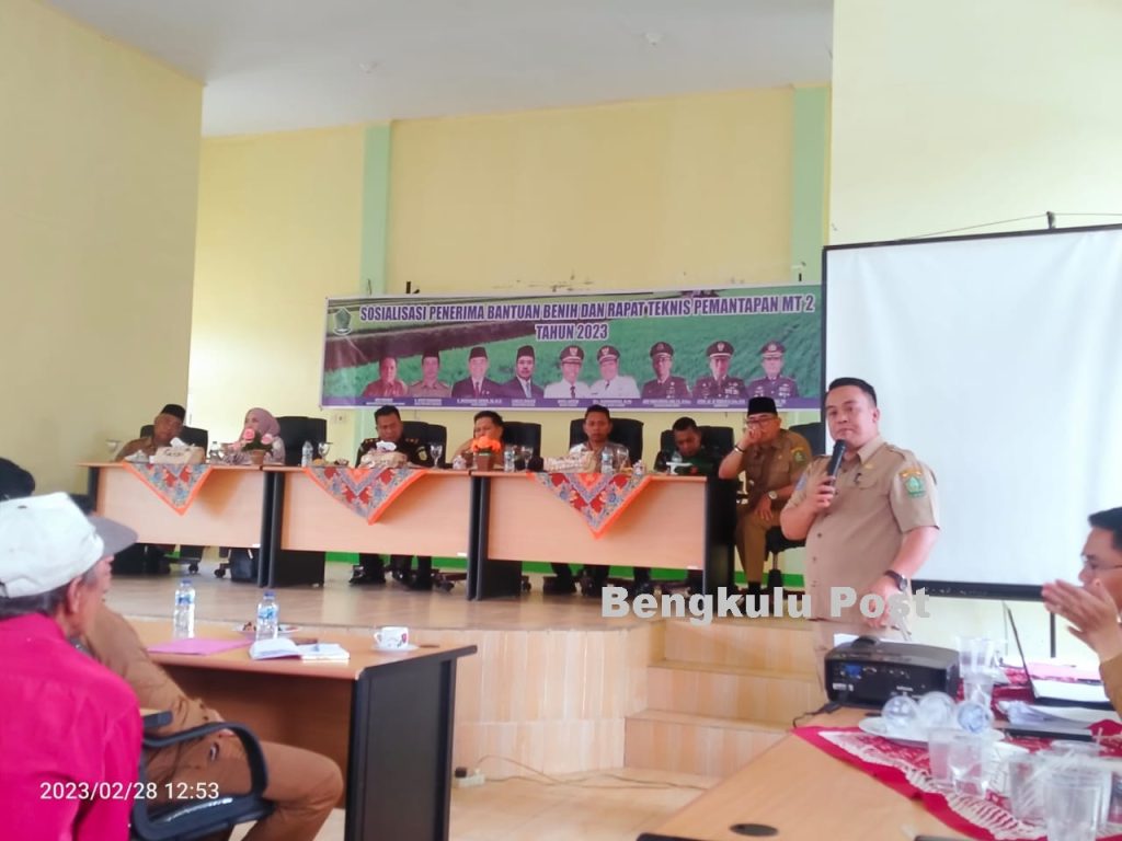 Bengkulu Post | Lebong-Pemkab Lebong,,menantang para petani padi di seluruh Desa di Kabupaten Lebong agar bisa menanam padi dua kali dalam setahun. Hal ini disampaikan Wakil Bupati Lebong saat menggelar Sosialisasi Penerima Bantuan Benih dan Rapat Teknis Pemantapan MT2 Tahun 2023 di Aula Dinas Pertanian dan Perikanan Kabupaten Lebong, Selasa (28/2) sekira pukul 10.00 WIB