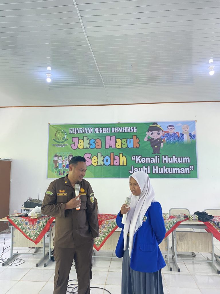 Kajari Kepahiang Ika Mauluddina, SH, MH melalui Kastel Nanda Hardika, SH didampingi Jaksa Fungsional Rizka Ari Kholifatur Rohman, SH mengatakan ” Kegiatan JMS merupakan program dari Kejagung yang harus di implementasikan dengan mendatangi sekolah – sekolah jenjang Sekolah Tingkat Atas maupun Sekolah Kejuruan, Jaksa sebagai nara sumber untuk memberikan materi di bidang hukum ” ujarnya.