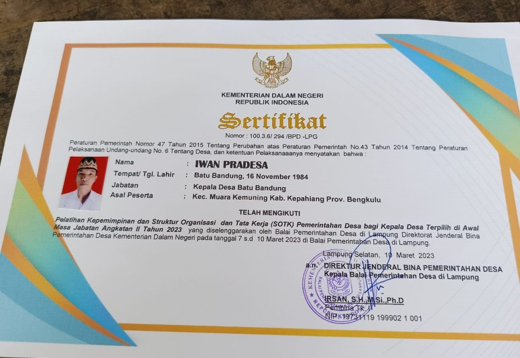 Kades se Kabupaten Kepahiang yang ikut pelatihan yang digelar di Balai Pemerintah Desa di Lampung tambahnya ” Kades Batu Bandung (saya sendiri), Kades Taba Saling (Irda Yuda Hartawan) dan Kades Embong Sido ( Fauzi), Semua yang kita pelajari dan diperoleh dari pemateri akan akan menjadikan suatu pijakan (dasar) dalam menjalankan kinerja di Pemerintahan Desa ” tegas Iwan.
