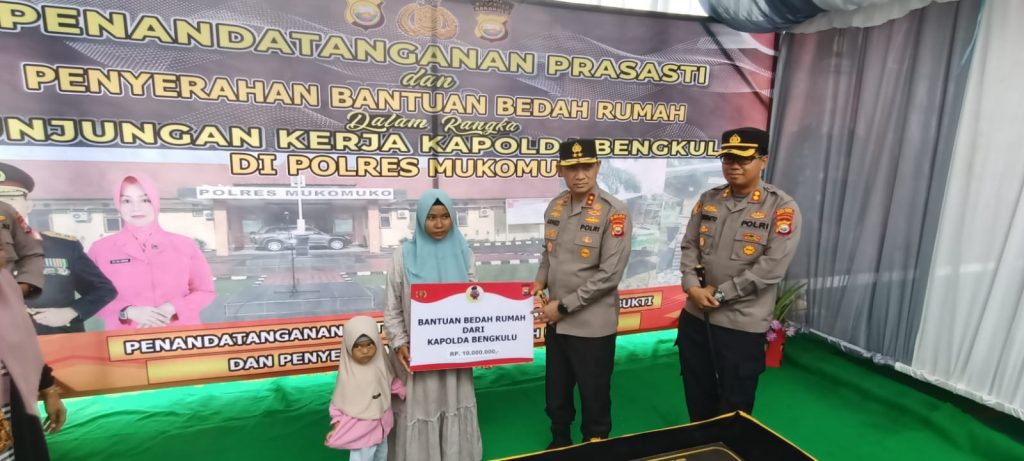 Kapolda Bengkulu melalui Kapolres Mukomuko AKBP.Nuswanto. SH ,S.Ik. MH mengungkapkan bantuan kegiatan Bedah Rumah adalah salah satu wujud nyata partisipasi Polri kepada masyarakat yang benar -benar membutuhkan demi mewujudkan hunian yang layak bagi warga yang sangat membutuhkan”ucap Kapolres