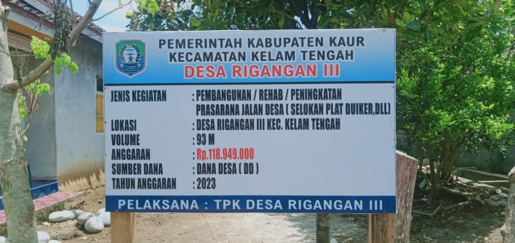 BENGKULU POST – KAUR,Pembangunan Rehab serta peningkatan fisik Prasarana jalan desa Selokan plat duiker sepanjang 93 meter tak lepas dari kepengawasan Buldi selaku kepala desa Rigangan III.