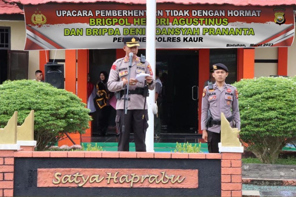 BENGKULU POST-KAUR.Kapolres Kaur Polda Bengkulu, AKBP Eko Budiman, S. IK, M. IK, M. Si pimpin upacara Pemberhentian Tidak Dengan Hormat (PTDH) dua personelnya, Jumat (31/3/2023) pukul 08.00 WIB.