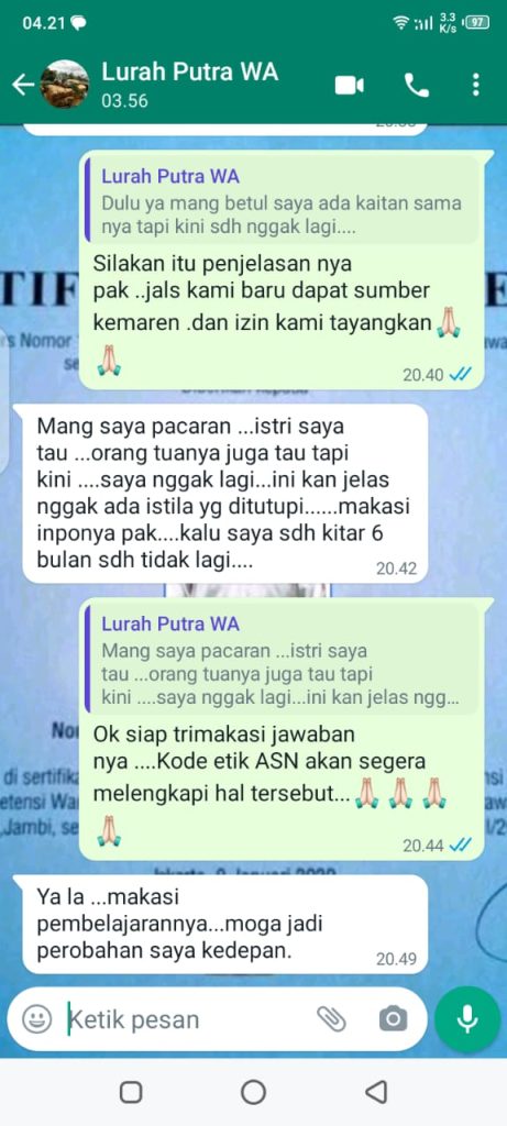 Tak lama kemudian lurah tersebut menghubungi awak media melalui via WhatsApp.dan mengakui segala perbuatan nya.
