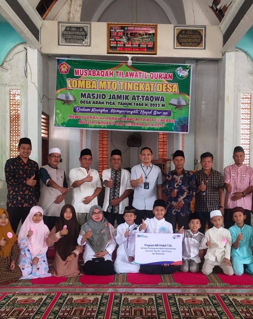 Sementara itu, Imam Masjid At-Taqwa Desa Arah Tiga Roby Masri, didampingi Ketua Pembangunan Masjid, H. Armansyah, menyampaikan rasa syukur dan terima kasihnya kepada Bank BRI atas bantuan tersebut. Selain itu, ia juga menyampaikan ucapan terima kasih kepada Anggota DPR RI Komisi XI Fraksi Gerindra Provinsi Bengkulu, Susi Marleni Bachsin.