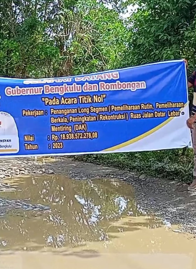 Entah siapa yang salah, awak media yang membuat berita atau Pemerintah Provinsi Bengkulu dalam hal ini Gubernur Bengkulu, yang jelas dalam spanduk tertulis pembangunan ruas jalan Datar Lebar Mentiring bukan Tanjung Kemuning Datar Lebar.