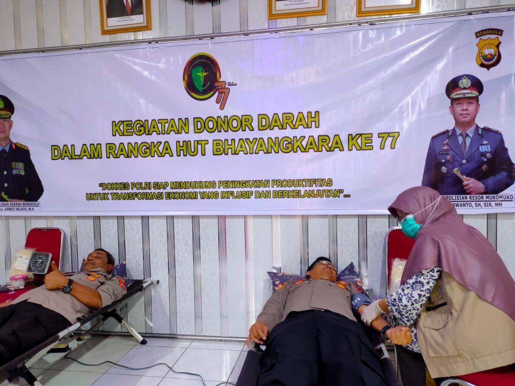 Sejak diumumkan akan diadakan kegiatan Donor Darah ini, Polres Mukomuko melalui momen memperingati HUT Bhayangkara ke -77 Kapolres Mukomuko AKBP Nuswanto, S. H, S. I.K,M.H dan PJU serta Kapolsek Jajaran dan para anggota yang bisa mendonorkan darahnya turut andil menyumbangkan darahnya.