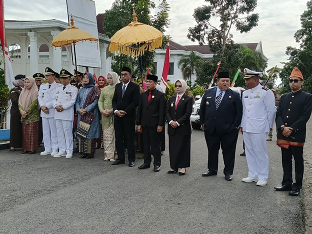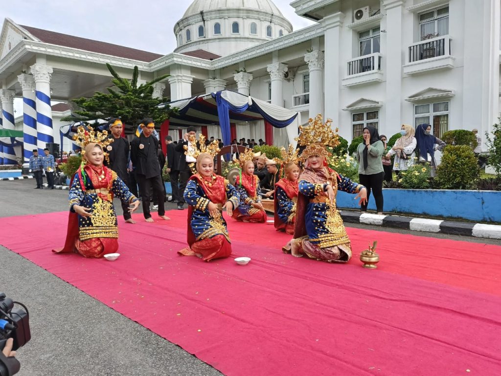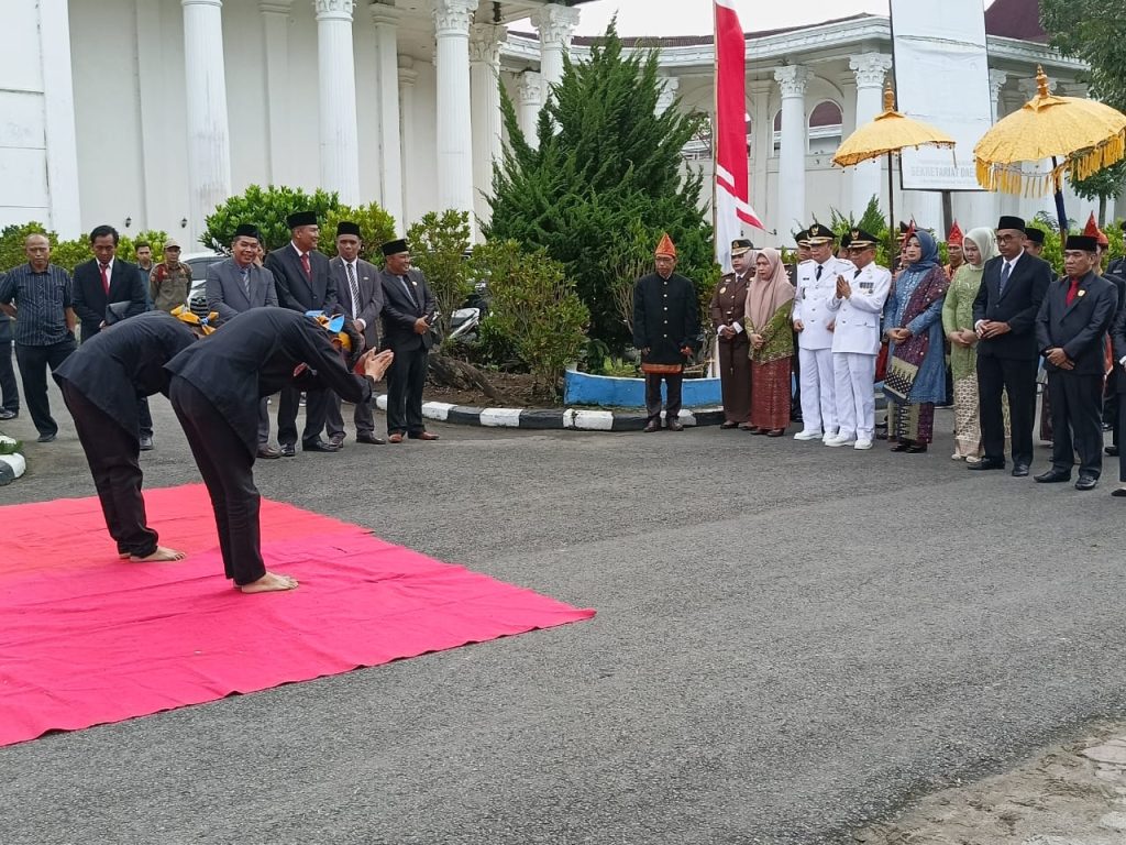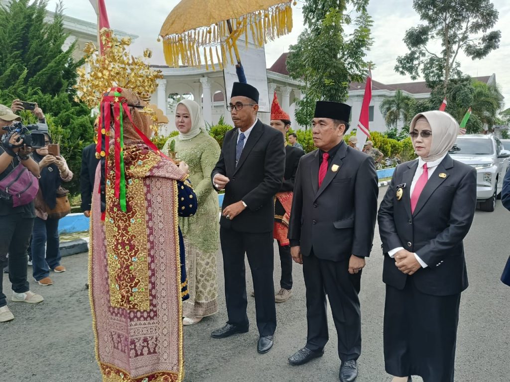 Kepahiang – Bengkulu Post.id –Sebelum dilaksanakannya giat upacara peringatan hari jadi Kabupaten Kepahiang secara serimonial Kepala Daerah bersama Forkompinda dan perwakilan anggota DPRD Kepahiang menyambut kedatangan tamu agung dari luar Kabupaten Kepahiang disambut dengan tarian dan pencak silat dari sanggar depun keme bertanda tamu dipersilahkan duduk ditempat yang telah disediakan, pada Minggu (7/1/2024).