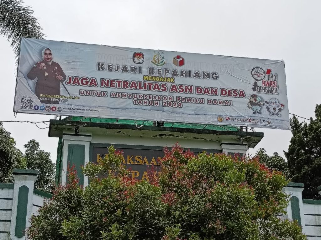 Kejari Kepahiang mengajak ASN dan Desa jaga netralitas untuk menyukseskan pemilu tahun 2024, Salah satunya dengan memasang baliho himbauan didepan kantor Kejaksaan Negeri Kepahiang.(stv).