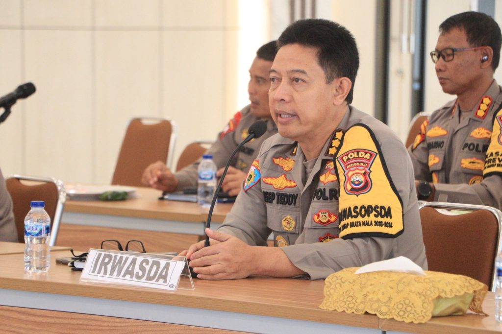 Bengkulu | Bengkulu Post_Irwasda Polda Bengkulu Kombes Pol Asep Teddy Nurasyah S.Ik., memimpin rapat secara virtual melalui Zoom Meeting, guna membahas kesiapan Polres/Ta Jajaran dalam pengamanan pungutan dan penghitungan suara Pemilu 2024, bertempat di Aula Rupatama Awaloedin Djamin pada hari ini (01/02/24) serta dihadiri oleh Pejabat Utama (PJU) Polda Bengkulu.