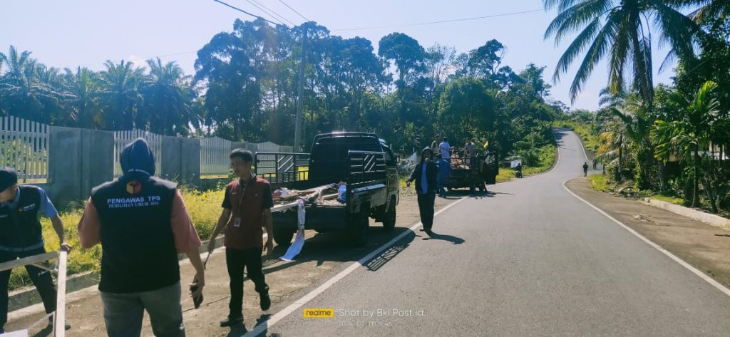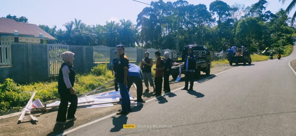 Mukomuko – Bengkulu post.id.– Tim gabungan Bawaslu kecamatan v koto menurunkan Alat Peraga kampanye yang terpasang di jalan Bendungan Manjuto kecamatan v koto kabupaten Mukomuko Minggu ( 10/2/2024 ) masa tenang 6 Pebruari sampai 13 pebruari 2024, sedangkan pencoblosan pileg jatuh pada hari Rabu tanggal 14 bulan Pebruari 2024.