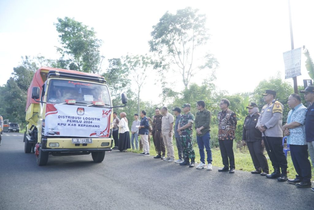 Kepahiang – Bengkulu Post.id –Bupati Kepahiang Dr. Ir. Hidayattullah Sjahid,MM.,IPU didampingi ketua KPU Kepahiang Ikrok,S.Pd serta unsur Forkompinda Kepahiang melepas logistik pemilu 2024.pada Selasa, (13/02/2024) di Lapangan Kantor KPU Kepahiang.