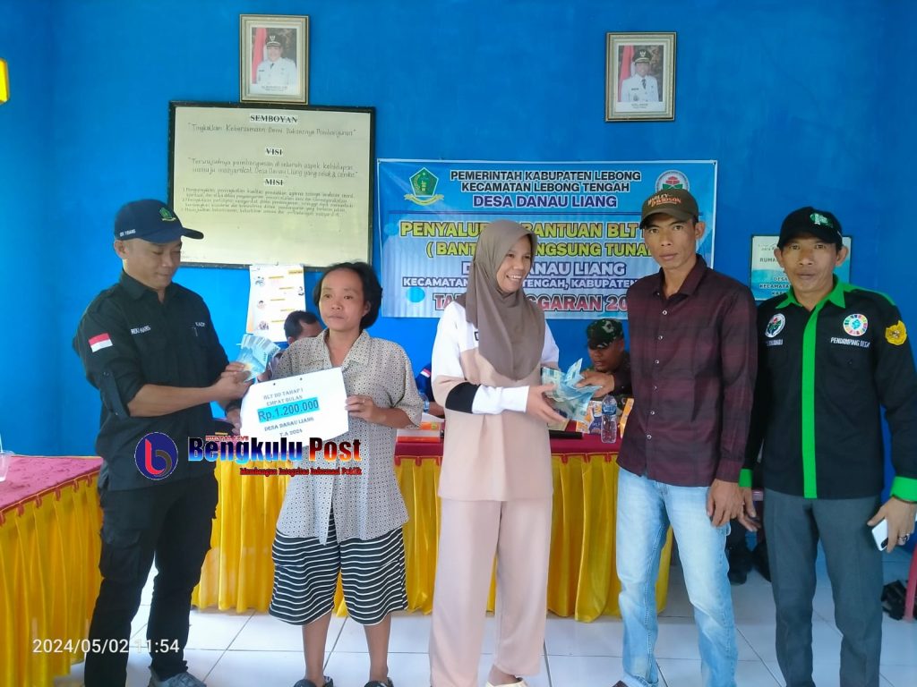 Bengkulu Post | Lebong-Pemerintah Desa Danau Liang Kecamatan Lebong Tengah Kabupaten Lebong melaksanakan kegiatan menyalurkan Bantuan Langsung Tunai (BLT) Dana Desa Untuk Bulan Januari, Februari , Maret dan April Tahun 2024 kepada 15 KPM yang dilaksanakan di kantor Desa setempat. Adapun besaran yang terima yaitu Rp.300.000,- per KPM setiap bulan selama 12 bulan selama Tahun 2024, dan hari ini para KPM menerima BLT sebesar Rp. 1.200.000 , (02/05/2024)