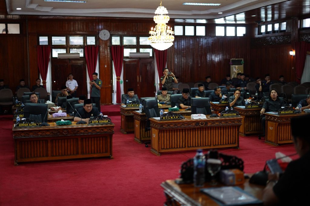 Rapat paripurna dipimpin oleh Ketua DPRD, Barli Halim, S.E didampingi Wakil Ketua I, Juli Hartono, S.E, M.Si dan Wakil Ketua II, Dendi Man Tarmizi, S.E, S.H, serta diikuti Anggota DPRD dari semua unsur fraksi.