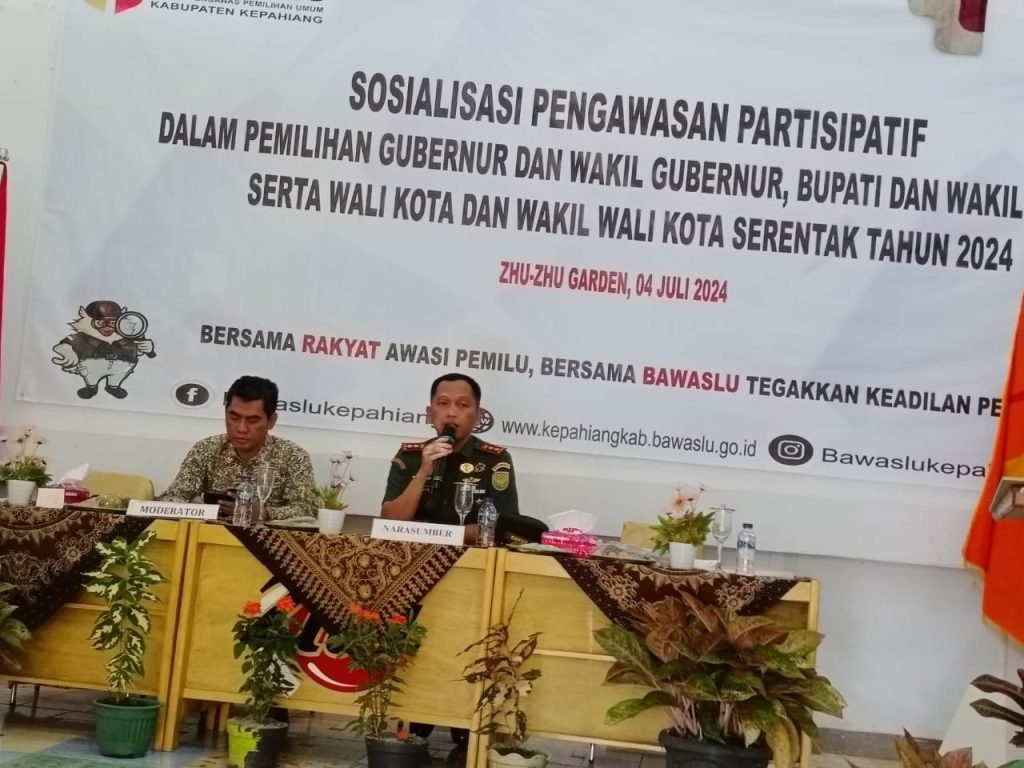 Sesi kedua selaku narasumber disampaikan Dandim 0409 R/L Letkol ARH Erfan Yuli Saputro menjelaskan peran serta TNI terkait pengawasan partisipatif dalam pemilihan Gubernur dan Wakil Gubernur, Bupati dan Wakil Bupati serentak 2024, memaparkan bagaimana rangkaian pelaksanaan pilkada berjalan damai, menekankan juga antisipatif mengenai berita bohong (hoax), Dandim 0409 R/L bekerja sama dengan pihak Bawaslu mulai pra hingga pasca pilkada di Kabupaten Kepahiang berjalan kondusif dan sangat mengharapkan kepada organisasi masyarakat khususnya yang ASN untuk tetap netral.