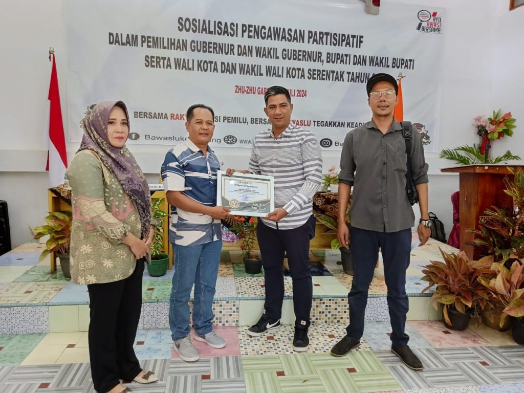 Ketua Bawaslu Kepahiang Mirzan Pranoto didampingi Erwin Prianto, Asuan Toni serta Koordinator Sekretariat Siti Atul Nuraini membuka acara secara resmi terkait kegiatan sosialisasi pengawasan.