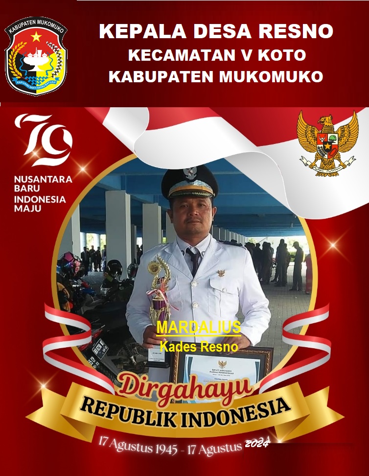 Kepala Desa Resno, Mardalius, Mengucapkan Selamat HUT-RI ke 79 Tahun 2024, ” Nusantara Baru Indonesia Maju “