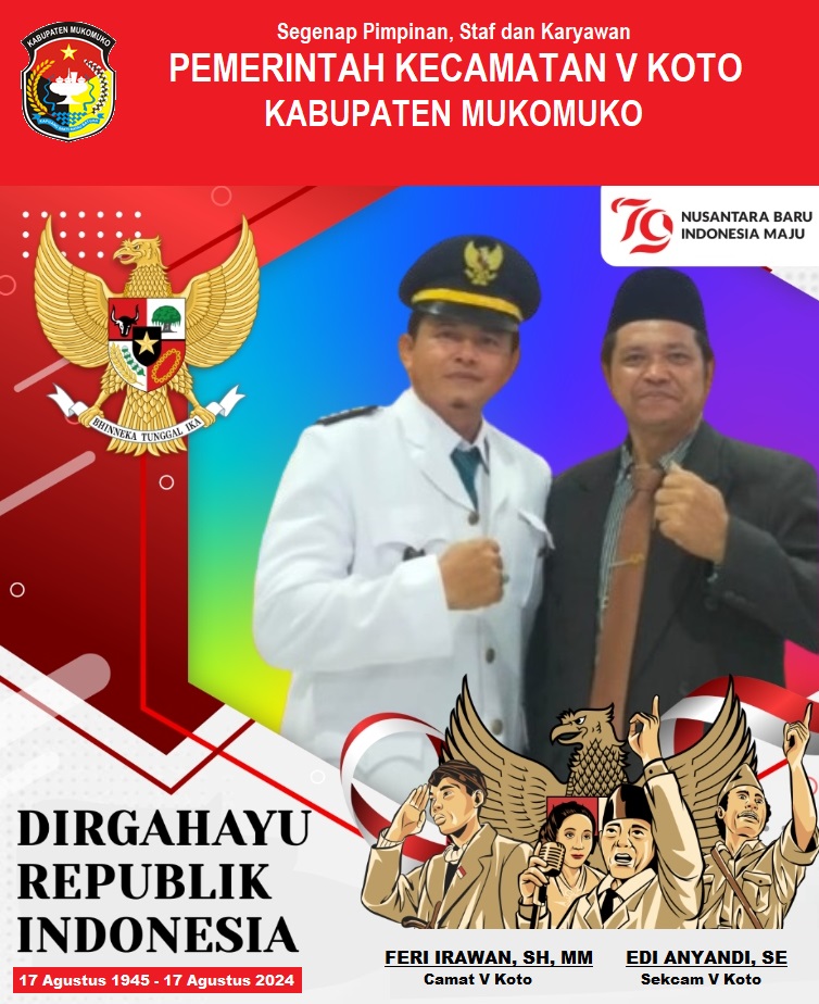 Pimpinan Staf dan Karyawan Kecamatan V Koto Mengucapkan : Selamat Merayakan HUT Kemerdekaan RI ke 79 Tahun 2024, Nusantara Baru Indonesia Maju