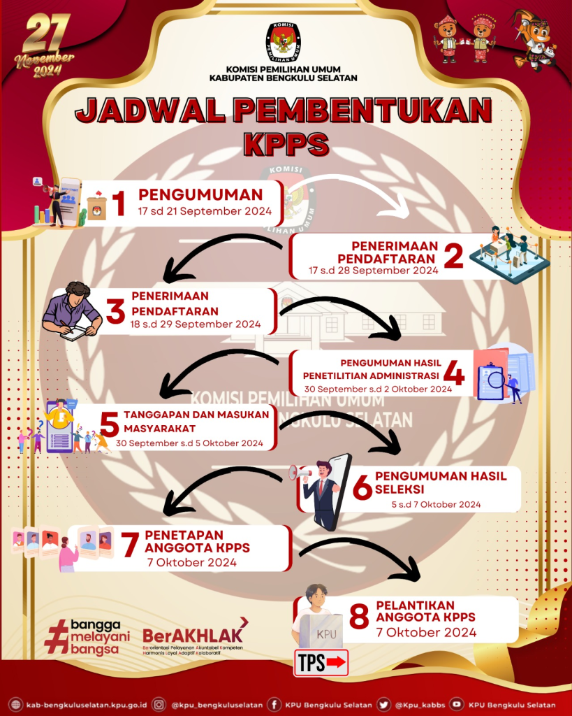 Penetapan dan pelantikan anggota KPPS dijadwalkan pada 7 November 2024, sementara masa kerja KPPS dimulai dari 7 November hingga 8 Desember 2024.