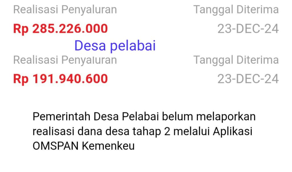 Dan Saat ingin dikonfirmasi langsung kepala desa pelabai.sulit untuk ditemui bahkan kantor desa pun suda tutup/dan mencubah konfirmasi melalui via WhatsApp.Guna untuk memintak hak jawab dan sanggahan dari anggaran yang di kelola ter untuk mulai dari tahun 2023.sampai di tahun 2024 agar berita ini berimbang sesuai pakta dan data..