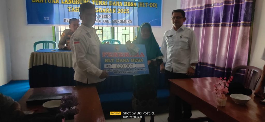 Mukomuko-Bengkulupost.id. –Dalam upaya mendukung program pemerintah untuk percepatan penghapusan kemiskinan ektrim, Pemerintah Desa Resno menyalurkan Bantuan Langsung Tunai Dana Desa (BLT DD) tahap I tahun 2025 kepada 10 KPM (Keluarga Penerima Manfaat), kegiatan yang digelar di Kantor Desa tesebut turut dihadiri Camat V Koto dan Kasi Pemerintahan, Kapolsek V Koto dan Bhabinkamtibmas, Kades dan perangkat Desa Resno serta warga penerima BLT DD, Selasa (19/2/25).