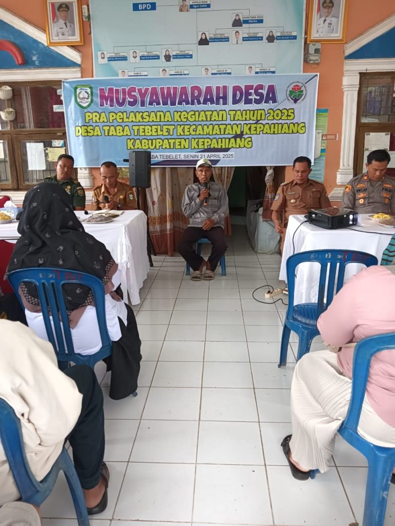 Diketahui, Penggunaan dana desa tahun anggaran 2025 di Desa Taba Tebelet seluruh kegiatan sudah tertuang dalam anggaran pendapatan belanja desa (APBDes) berjalan, dan tahun ini untuk kegiatan fisik akan mengerjakan pembangun jalan dan pengadaan lampu jalan termasuk mendukung pelaksanaan program ketahanan pangan yaitu Asta Cita Presiden RI.