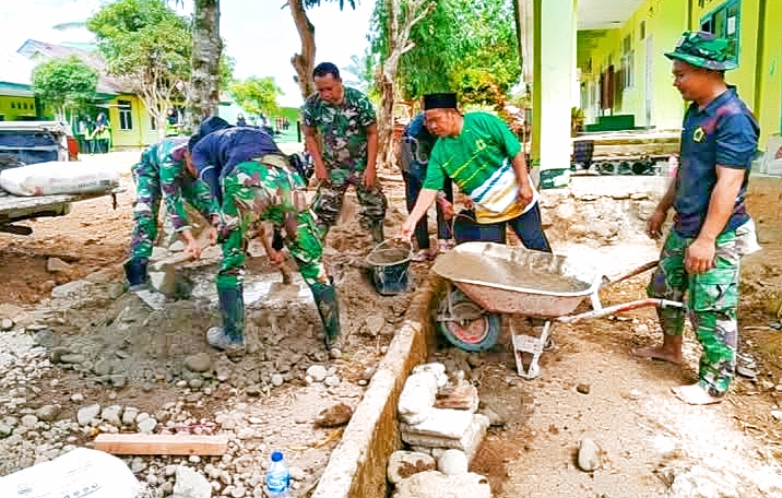 Anggota Satgas TMMD bekerja secara sistematis, mulai dari menyiapkan bekisting, menyusun besi rangka, hingga pengecoran menggunakan adukan semen yang dikerjakan secara manual bersama warga.