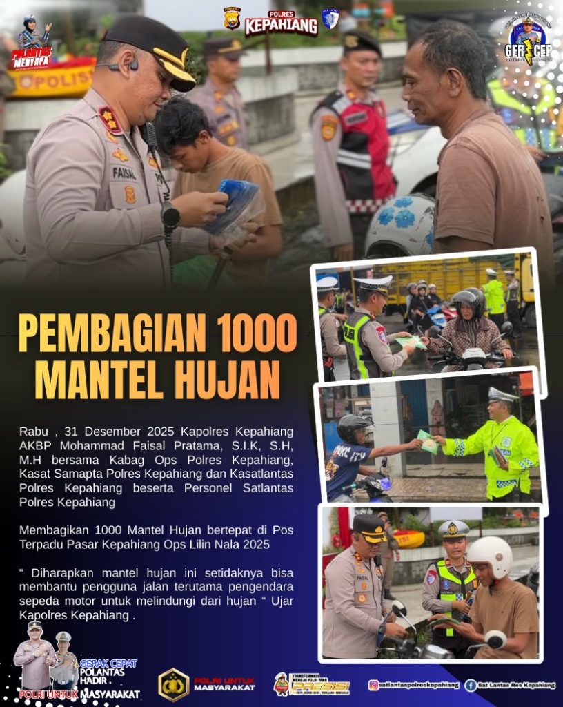 ” Diharapkan mantel hujan ini setidaknya bisa membantu pengguna jalan terutama pengendara sepeda motor untuk melindungi dari hujan dan juga mengucapkan selamat Nataru 2026 mari sama – sama untuk menjaga kamtibmas“ ujar AKBP M. Faisal Pratama, S.IK.