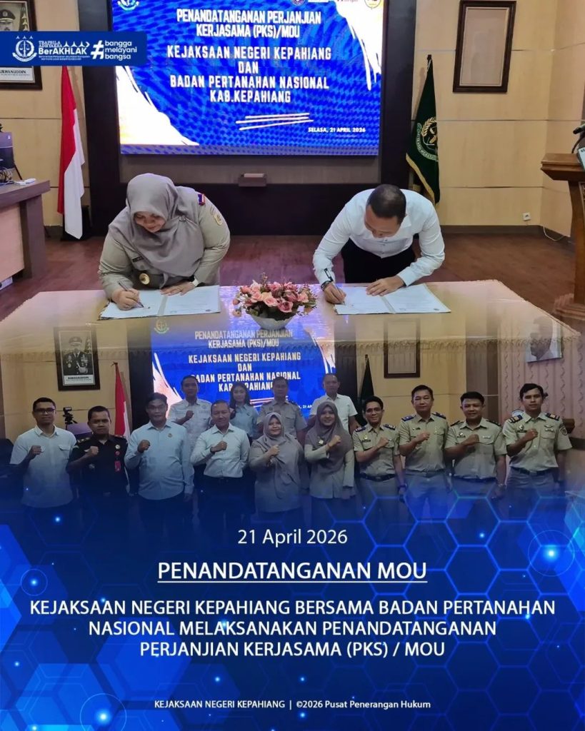 Kepahiang – Bengkulu Post.id –Untuk memperkuat sinergitas dan koordinasi bersama ( Kejari Kepahiang dan BPN Kepahiang) dalam rangka mendukung penegakan hukum di bidang pertanahan khususnya pencegahan dan penanganan permasalahan, maka atas inisiasi Kepala Kejaksaan Negeri Kepahiang bersama para Kasi dan Kasubsi pada Kejaksaan Negeri Kepahiang melaksanakan kegiatan Penandatanganan Perjanjian Kerjasama (PKS) / MOU bersama Badan Pertanahan Nasional (BPN) Kabupaten Kepahiang, Giat dilaksanakan di ruang serbaguna Kejari Kepahiang, pada Senin (21/4/2026).